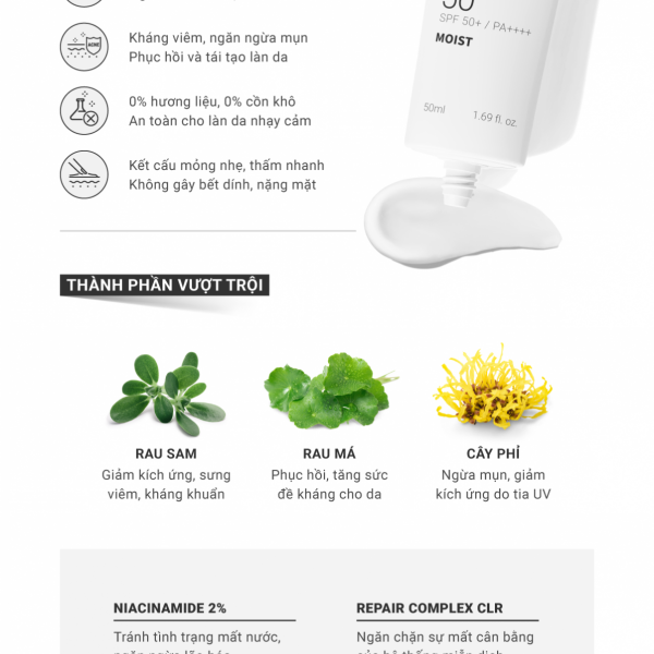 ◾️ Ngừa mụn X3: chiết xuất rau má, rau sam, cây phỉ